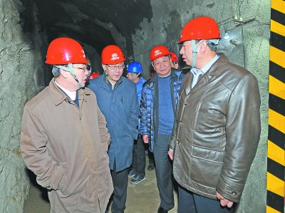图为孟凤朝陪同徐福顺(左一)在中铁十四局北京地铁8号线3期3标前门站项目隧道内检查安全生产情况。李锦龙 摄