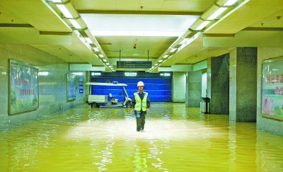 1.一名抢险队员在武昌火车站地下通道查看洪水灾情。