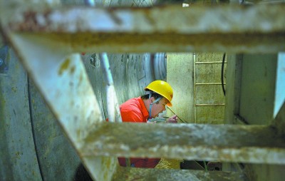 4.石武高铁祁家湾梁场建设者进行提梁机检修作业。
