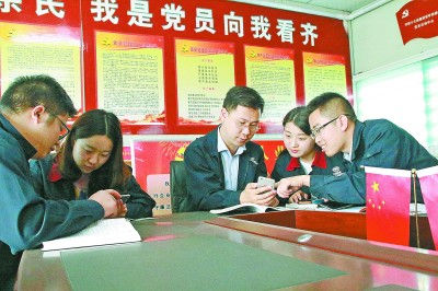 日前,中铁十七局张呼项目部党员活动室布置一新,除了有实时更新的党报、党刊和党员学习书籍外,还把党员日常党课学习笔记及心得体会等,悬挂在党员活动室内。图为党员们正在围绕党建微信平台上有关学习内容进行探讨。 朱俊羽 摄