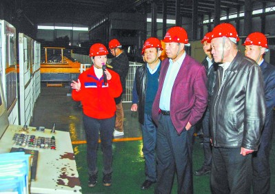 图为孟凤朝陪同倪小庭(右一)到铁建重工道岔分公司车间调研。陈 洋 摄