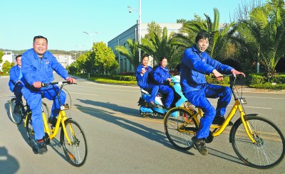 图为职工高兴地使用“小黄车”。孟笑宇 摄 |
