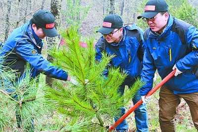 图为该公司职工齐心协力栽种树苗。郭可盈 摄