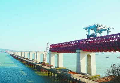 图为4月5日,在福平铁路平潭海峡公铁两用大桥大练岛侧施工中,中国铁建大桥局四公司采用双孔连做造桥机,缩短了架梁工期,实现了17天过孔。陈 雷 摄
