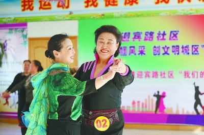 为丰富退休女职工的精神文化生活,同时以丰富多彩的活动助力怀柔区创建全国文明城区,日前,中铁十六局四公司离退办与怀柔迎宾路社区联合举办了以“舞巾帼风采 创文明城区”为主题的交谊舞大赛。图为交谊舞大赛现场。 杨宏妍 王崇燕 摄