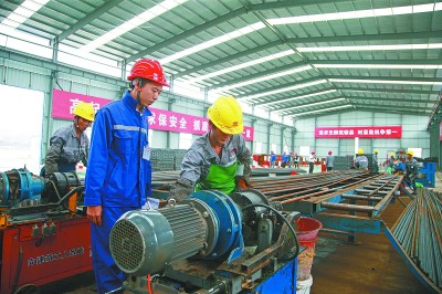 中铁十五局城建公司在南京扬子江隧道建设中,积极推行工厂化流水线作业,提高专业化生产能力。该项目的钢筋加工厂采用自动化方式,日加工钢筋260吨以上,降低了原材料损耗,减轻了劳动强度,提高了施工效率。图为4月26日,工人正在进行钢筋加工作业。