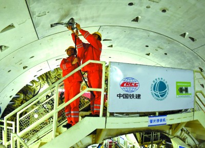 中铁十四局大盾构公司施工的苏通GIL综合管廊长江隧道,全长5.5公里,是目前穿越长江的最长隧道。现累计掘进超过3.3公里,掘进总里程占比60%,安全质量全面受控,受到业主贺电嘉奖。图为技术工人运输和安装管片。刘福昌 摄