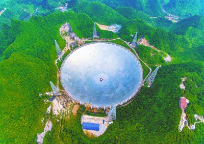 左图为中铁十一局参建的世界最大单口径射电望远镜工程——国家天文台FAST天眼。徐云华 摄