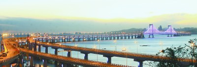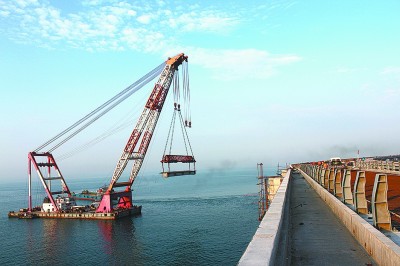 ◀大连星海湾跨海大桥海上浮吊式架梁。