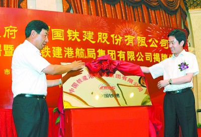 2011年8月8日,中国铁建董事长、党委书记孟凤朝(左)和四川省委常委、宣传部部长,珠海市原市委书记甘霖(右)在珠海为中国铁建港航局成立揭牌。刘 文 摄
