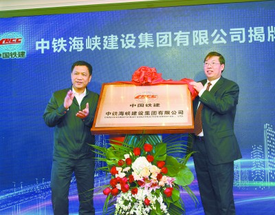 2015年12月7日,中国铁建总裁庄尚标(右)和厦门市委常委、秘书长,厦门市原副市长黄文辉(左)为中铁海峡建设集团成立揭牌。王英威 摄