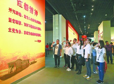 在“五四”青年节来临之际,为使团员青年接受爱国主义教育和革命传统教育,中铁十四局电气化公司组织团员青年参加“重走一大路”活动,深入学习习近平总书记提出的“红船精神”。图为嘉兴南湖革命纪念馆内,青年团员们在“红船精神”展示墙前宣誓。