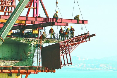 目前,由中国铁建大桥局四公司承建的福平铁路平潭海峡公铁两用跨海大桥已全面进入上部公路梁施工。该桥公路梁主要采用悬灌梁挂篮施工法,有68个挂篮,是全国挂篮数量最多的跨海大桥。为保障挂篮模板安装施工按期推进,建设者在“五一”期间坚守施工一线,全力保障挂篮模板安装作业。图为建设者正在调整挂篮外侧模板。