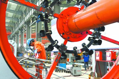 中铁十二局三公司京唐高速铁路项目部推行工厂化、自动化作业,运用全自动滚焊机、数控钢筋弯曲中心等一系列科技含量高的设备,提高工效3倍多,提升了专业化生产能力。图为京唐高速铁路4标二分部工人正在操作全自动滚焊机。