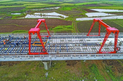 经过两年多的紧张施工,(武)汉十(堰)高铁正式进入无砟轨道施工阶段。汉十高铁是湖北省目前投资最大的在建高铁,线路全长399公里,设计时速350公里,预计2019年底投入运营。图为中铁十一局一公司汉十高铁枣阳市境内无砟轨道道床板施工现场。新华社记者 杜华举 摄