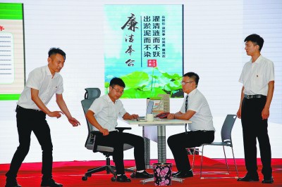 日前,中铁十七局二公司举办了“唱响廉洁好声音”文艺活动。该公司机关党委所属5个党支部的党员干部参加了演出。廉洁歌曲大合唱、诗朗诵、舞蹈、独唱、小品等精彩纷呈的节目紧扣廉洁主题,让廉洁教育更直观,更有吸引力。图为该公司职工在表演自编自导小品——《戏里戏外》。 刘 桢 摄