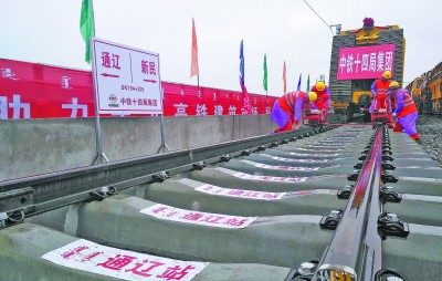 5月22日,内蒙古自治区连接东北地区的首条高铁——辽宁新民北至内蒙古通辽高铁全线铺轨完成,与在建的京沈高铁正式“牵手”。新通高铁于2016年6月开工建设,是国家中长期铁路网规划“八横八纵”高速铁路网的组成部分,与在建的京沈高铁相连接,汇入东北地区乃至全国高铁网。新通高铁建成通车后,通辽到沈阳的列车运行时间将由5个小时缩短到1.5个小时左右,通辽到北京将由14个小时缩短到3.5个小时左右。图为中铁十四局员工正在对铺通后的500米长钢轨锚固螺栓进行加固。尹 辉 摄