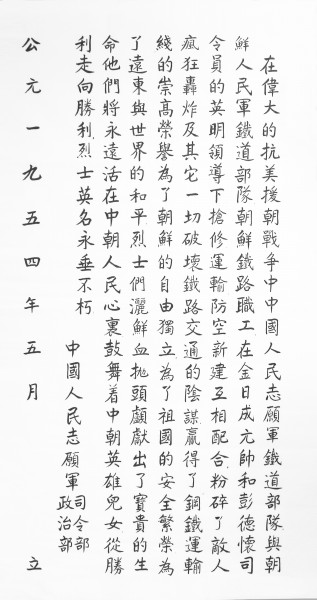 2015年10月12日晚,我在中央电视台新闻联播中,看到十八届中共中央政治局常委刘云山在访问朝鲜期间,到新安州扫祭志愿军烈士陵园,荧屏上突现“中国人民志愿军铁道部队烈士纪念碑”,我非常激动,这不就是我书写碑文的那个烈士纪念碑吗!60多年前,抗美援朝时的抢修、新建铁路战场,与敌机、严寒、洪水做斗争流血、牺牲的悲壮情景,又一次浮现在眼前,引起我对抗美援朝战争年代的无限回忆。