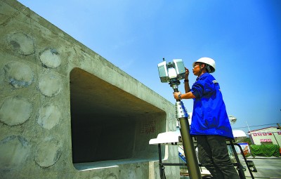 中铁十一局桥梁公司郑万高铁南漳制梁场为提高对箱梁的检测精度,研发了箱梁外形尺寸自动检测系统,为国内首创。该系统通过三维激光扫描技术直接获取待测箱梁的三维点云数据,生成点云模型,计算分析外形尺寸并生成分析报表,可快速、准确掌握箱梁外形尺寸真实状况。图为技术人员在运用三维检测仪检测箱梁外形。
