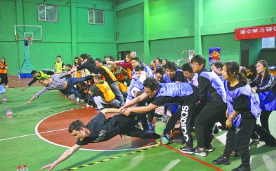 为培养员工团结协作精神,近日,中铁十六局物贸公司开展了为期两天的户外拓展训练。图为参加拓展训练的员工合力完成“取水”任务。 于方舟 摄