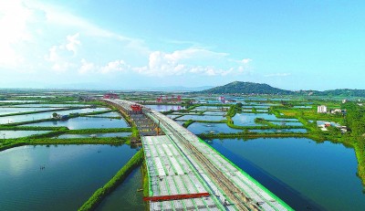 中铁十八局一公司潮汕环线项目部在河溪2号高架桥施工中,为避免泥浆对河道环境造成污染,利用新工艺新技术对施工污水和生活污水进行净化处理,达到标准后方可排放。项目进场两年多来,工地周边依然是花草丛生,河水清澈,受到当地政府和百姓好评。图为建设中的河溪2号高架桥。张向辉 摄