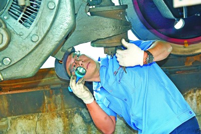 近日,为弘扬工匠精神、提升检验运输专业队伍能力水平,中铁十六局铁运公司举办了第三届“奋进杯”运输系统职工技术比武大赛。此次技术比武活动采用理论测试和现场实际操作相结合的形式,为优秀技能人才搭建展示自我与交流竞技的舞台。图为在现场实际操作比赛中,内燃机车学习司机对机车底部进行检查。马 勇 摄