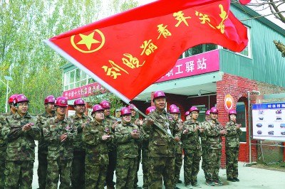 跨京九铁路转体桥施工是北京新机场北线高速公路的控制性工程,按期完成转体施工任务是实现主体工程年底贯通目标的关键之一。为进一步激励广大青年职工发挥敢打、敢拼、敢啃硬骨头的攻坚精神,中铁十六局新机场北线施工总承包部在转体施工现场成立“刘晓萌青年突击队”,全力保安全、保质量、保转体、保贯通。图为11月6日,“刘晓萌青年突击队”授旗仪式现场。常 虹 摄