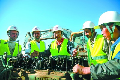 为提高“洋徒弟”的施工技术,中铁十七局二公司阿尔及利亚项目部选取施工经验丰富的职工担任导师,进行“一对一”教学,让阿籍工人快速熟练地掌握施工技术。现在,每年有十多对中阿员工结成师徒关系,不但促进了当地青年就业问题的解决,树立了良好的企业形象,而且促进了中阿友谊不断升温。图为机械修理工郑永勋正给“洋徒弟”讲解汽车发动机高压油泵的工作原理。