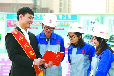 在全国法制宣传日暨国家宪法日来临之际,中铁二十五局房地产公司开展了法制宣传教育系列活动,通过“三会一课”、专题研讨、微信推送、志愿者送法下基层等,营造学法、懂法、守法的良好氛围,守护了依法治企的“一片蓝天”。图为该公司普法志愿者王启铭为项目职工讲解宪法知识。 宋学乙 摄