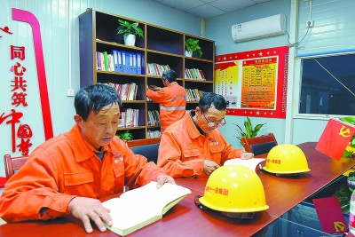 中铁十一局城轨公司杭州供水管道5标联合杭州市拱墅区图书馆在项目驻地建设了“流动图书角”,免费向一线作业人员开放,深受基层员工的喜爱。该项目部还定期开展集中阅读会、读书分享会,不断丰富基层员工的业余生活。图为项目员工下班后在“流动图书角”阅读学习。赵金飞 摄