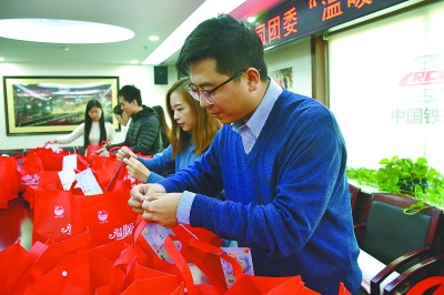 12月12日,中铁十六局城发公司把干部职工们提前捐赠的棉服冬衣进行筛选、打包,装入统一制作的爱心包裹中,准备交由大学生志愿者在寒假返乡时转送给当地贫困户家庭,用爱心传递的方式为冬日里需要帮助的人送上中国铁建的温情暖意。图为青年职工正为爱心包裹系祝福卡片。冯坤龙 摄