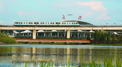 近日,由中国铁建设计施工总承包的长沙磁浮工程获得2018-2019年度国家优质工程金质奖。长沙磁浮快线是我国第一条全产业链自主创新、掌握核心关键技术的中低速磁浮铁路。图为一列磁浮列车快速驶过长沙黄花机场。