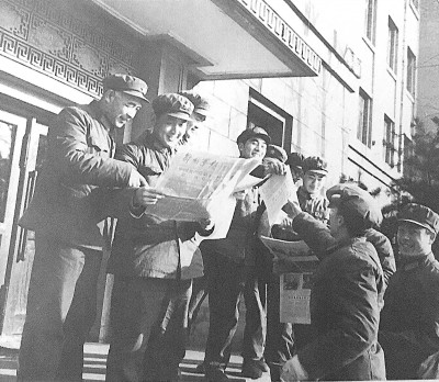 1978年12月22日,铁道兵广大指战员热烈欢呼中国共产党第十一届中央委员会第三次全体会议胜利召开。图为指战员在铁道兵机关办公大楼前分发“三中全会”公报。