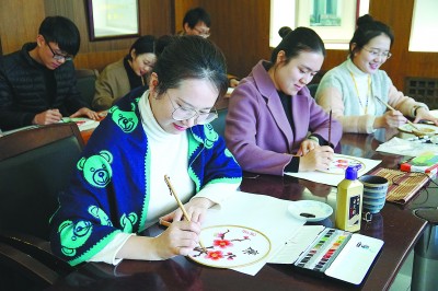 在元旦来临之际,为提醒干部职工廉洁过节,中铁十六局城发公司规划设计研究院党支部组织设计师们开展绘制“廉洁团扇”活动。图为设计师们正在团扇上绘制象征廉洁的“梅、竹、松”等。
