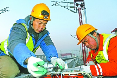 12月27日,由中铁十四局电气化公司承建的北京新机场线停车场信号系统联锁开通,作为全线首个车站开始车辆冷滑实验,开启国内首条160公里时速地铁动车调试。图为工人检查停车场电动转辙机,为信号联锁开通做最后的道岔调试。 范成涛 摄