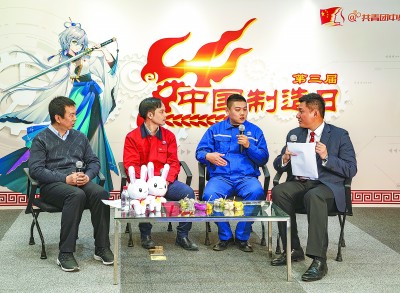 12月26日,由共青团中央、国务院国资委共同发起的第三届中国制造日活动在“线上线下”同步进行。中国铁建职工代表受邀做客团中央全媒体平台“团团”直播间,讲述大国重器盾构机的前世今生。图为中铁十四局京张高铁清华园隧道建设者赵斌(右二)和铁建重工研发人员暨智勇(右三)与主持人互动。范少文 摄