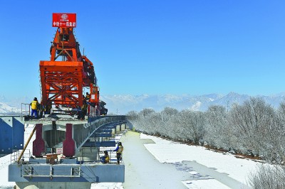 近日,全长5727米的拉林铁路最长桥梁——贡嘎雅鲁藏布江特大桥T梁铺架全部完成。施工期间,中铁十一局三公司建设者克服高寒、缺氧、风沙大、超低温等困难,确保工程顺利完工。图为正在铺架的贡嘎雅鲁藏布江特大桥。俞文喜 摄