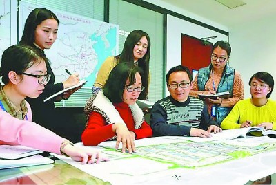 孙逊带领大家研究设计方案。 张启山 摄 |