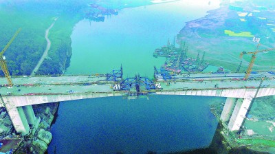潼(南)荣(昌)高速公路涪江特大桥是重庆市首个全国绿色公路建设典型示范工程,也是全线控制性工程。施工中,中国铁建港航局创造性地采用双挂篮合龙工艺,既降低了安全风险,也大大提高了桥梁线型精度。图为3月9日,涪江特大桥左幅中跨合龙。 曹 义 摄