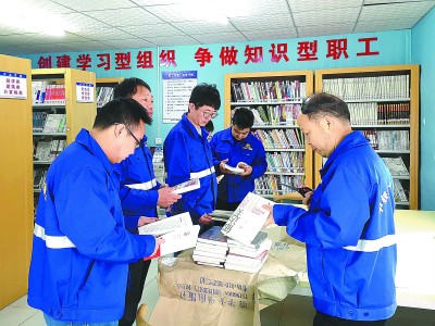 3月17日下午,位于武汉市的中铁十一局建安公司梧桐苑三期项目部收到湖北省总工会宣教部赠送的508册书籍,涉及文史、技术、生活、法制等方面内容,至此,该书屋藏书总量达到3200余册。据悉,该项目职工书屋为湖北省职工书屋示范点,此次捐赠,推进了该书屋的建设与升级。图为职工们正在挑选自己喜欢的书籍。黄佩文 摄