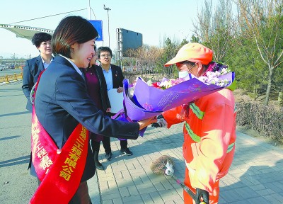 日前,中国铁建电气化局二公司开展了“巾帼心向党 扬帆新征程——最美的花送给最美的你”系列活动。图为该公司工会向奋斗在一线的“城市美容师”环卫女工代表送上鲜花,表达祝福与问候。张 云 摄
