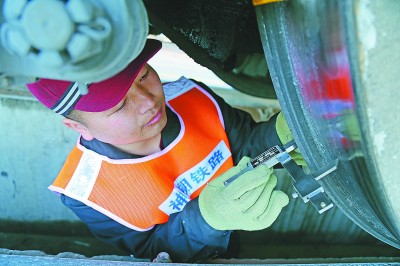 铁路运营是中铁二十局四公司的主营业务之一。为进一步提高机车检修整备质量,确保机车以良好状态投入运营,日前,该公司组织技术人员对所属机车进行全面鉴定整修,消除机车运行故障等隐患,确保行车安全。图为四公司员工正在检查机车轮缘数据。黄天龙 摄