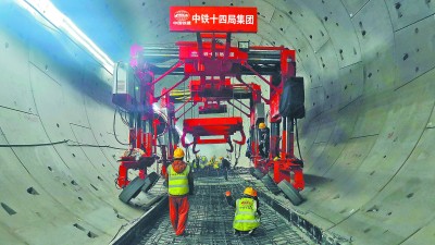 ▼3月25日,中铁十四局首次将轮胎式铺轨机引入北京地铁建设中,在保障安全质量的前提下工效提高69%。北京新机场线列车设计时速160公里,为国内目前时速最快的地铁。图为工人在操作轮胎式铺轨机铺设底座板钢筋网片。刘 静 摄