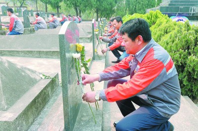 4月1日,中铁十四局三公司昆楚项目部职工到金山铁道兵烈士陵园,开展“传承·2019年清明祭英烈”活动,以默哀、敬献鲜花、重温入党誓词、擦拭墓碑的形式,缅怀在成昆铁路建设中牺牲的铁道兵战士。图为项目职工向烈士墓献花。张雷锋 摄