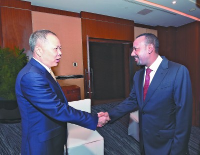 图为埃塞俄比亚总理阿比与陈奋健亲切握手。 李锦龙 摄 |