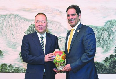 图为陈奋健向沙特交通部长纳比尔·阿尔阿穆迪赠送纪念品。李锦龙 摄 |