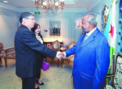 图为庄尚标与吉布提总统盖莱亲切握手。李锦龙 摄 |