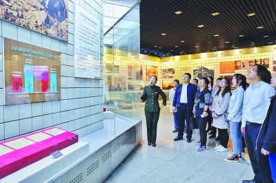 4月25日,中铁二十二局四公司团委组织50余名青年职工走进平津战役纪念馆,开展以“立鸿鹄志,做奋斗者”为主题的参观活动。一件件文物和一幅幅历史照片让青年们切身感受党领导全国人民从胜利走向胜利的光辉历史,思想得到洗礼。图为青年职工在观看平津战役史料。 于 泽 摄