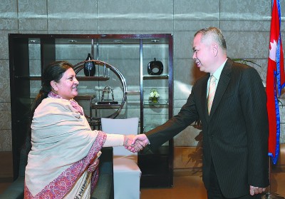 图为陈奋健与尼泊尔总统班达里亲切握手。李锦龙 摄 |