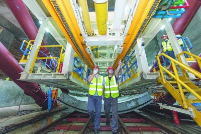 中铁二十二局轨道公司广州地铁18号和22号线项目通过加长洞门钢环宽度,在钢环内圈安装盾尾密封刷进行注脂,实现了洞门双重止水效果,有效克服了广州市富水沙层盾构始发的技术难题。日前,该项目部首台大直径泥水盾构机始发。图为技术人员在讨论解决方案。桂天奇 摄